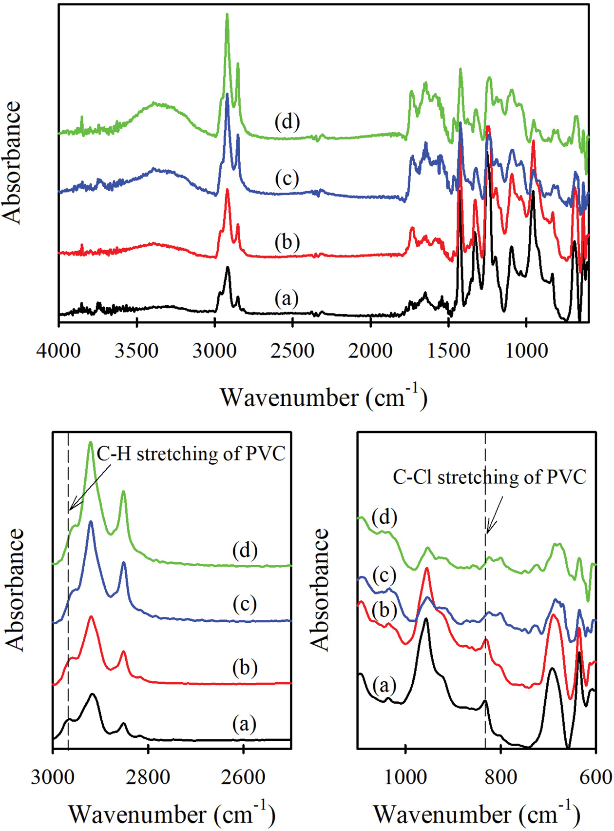 Figure 6 FTIR spectra of PVC/GO-g(6.4%)-PCL composite sfilms. GO-g(6.4%)-PCL content (wt%): (a) 0 (neat PVC); (b) 0.1; (c) 0.3; (d) 0.5. |