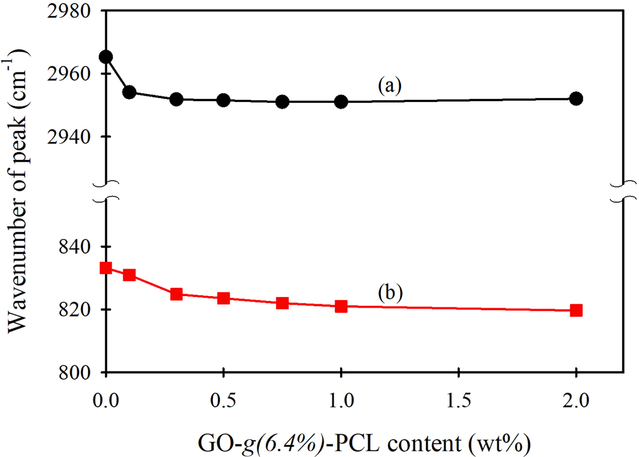 Figure 7 Changes in band positions of (a) C-H stretching; (b) CCl stretching from FTIR spectra of PVC/GO-g(6.4%)-PCL composite s-films according to the GO-g(6.4%)-PCL content. |