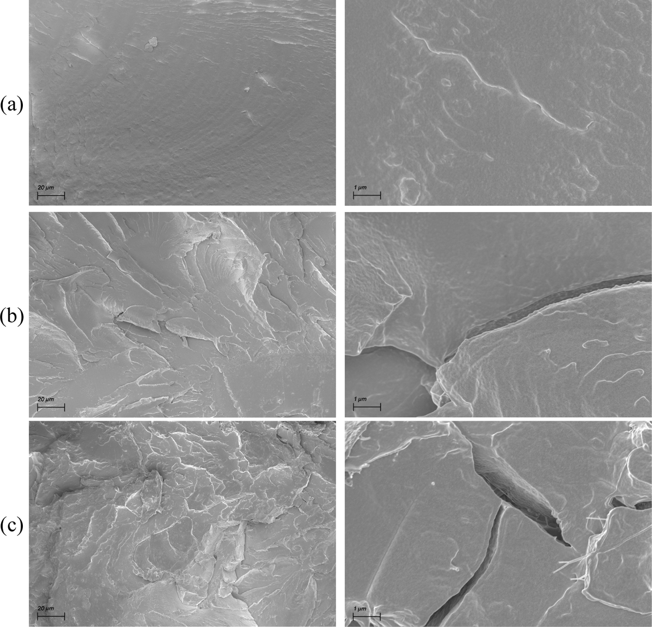 Figure 8 FE-SEM images of the fractured surfaces of PVC/GOg(6.4%)-PCL s-films. GO-g(6.4%)-PCL content (wt%): (a) 0.3; (b) 0.5; (c) 2. Magnification: left ×500, right ×10000. Scale bar: left 20 µm, right 1 µm. |