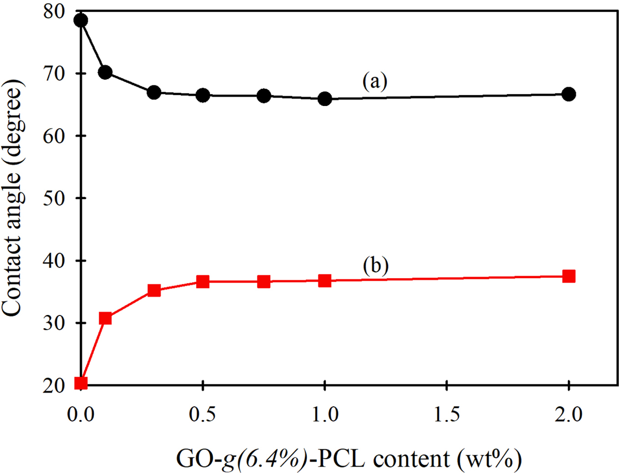 Figure 9 Water contact angles of PVC/GO-g(6.4%)-PCL composite s-films with various GO-g(6.4%)-PCL contents. Wetting liquid: (a) water; (b) diiodomethane. |