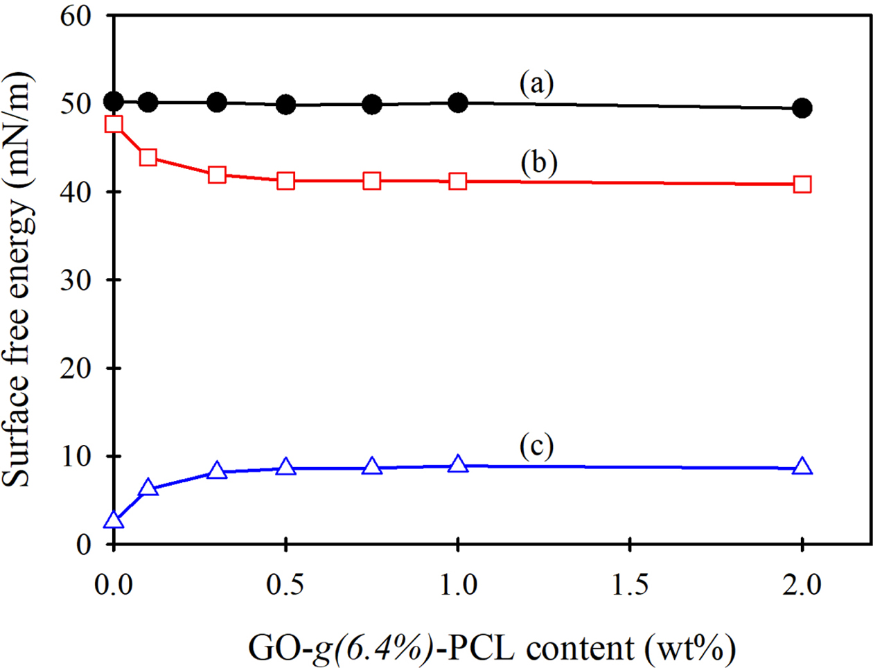 Figure 10 Changes in surface free energies of PVC/GO-g(6.4%)- PCL composite s-films according to the GO-g(6.4%)-PCL content. (a) surface free energy (γs); (b) dispersive component of surface free energy (γs d ); (c) polar component of free surface energy (γs p ). |