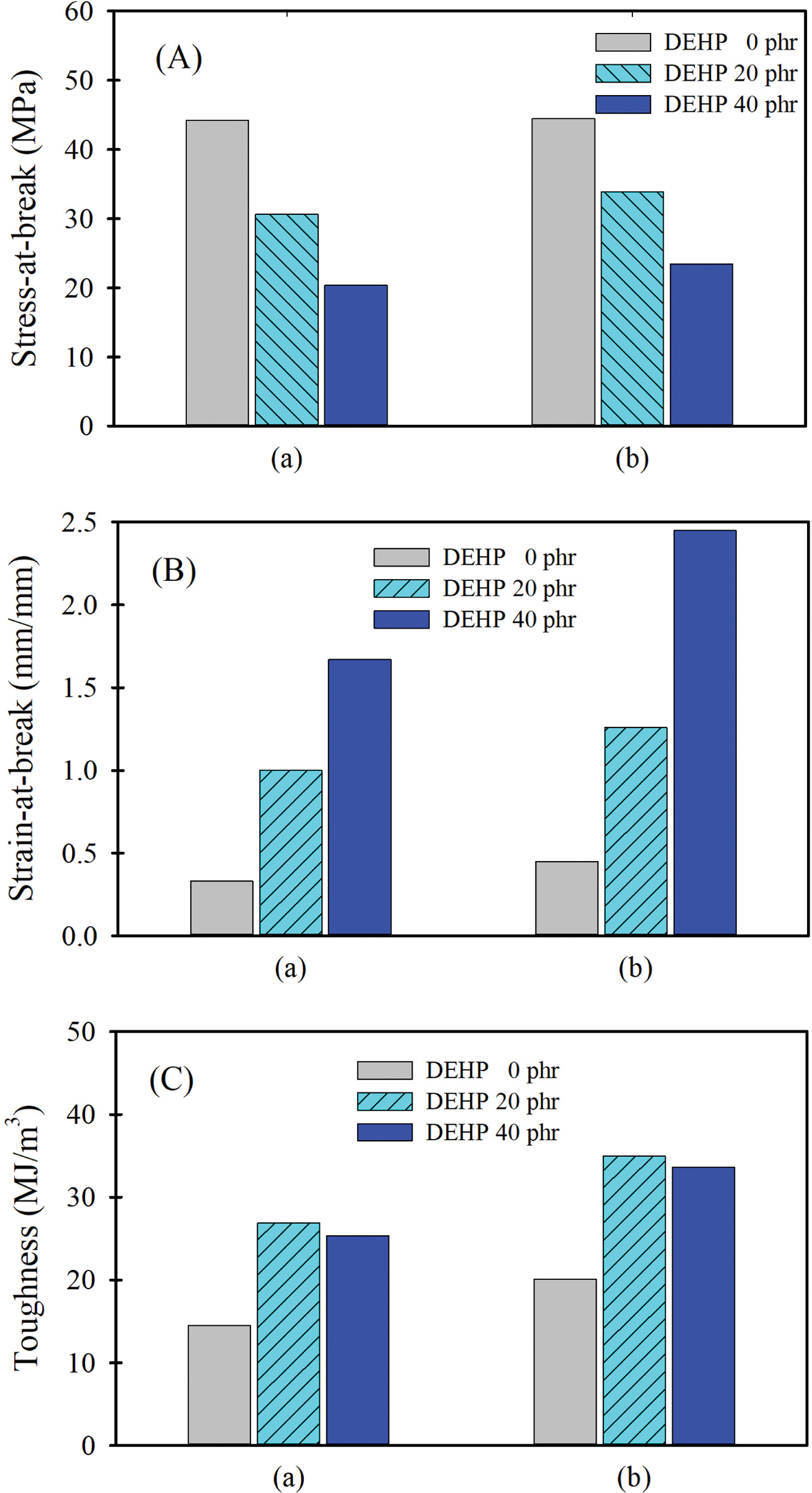 Figure 11 (A) Stress-at-break; (B) strain-at-break; (C) toughness of (a) neat PVC; (b) PVC/0.3 wt% GO-g(6.4%)-PCL composite mfilm containing various plasticizer (DEHP) contents. |