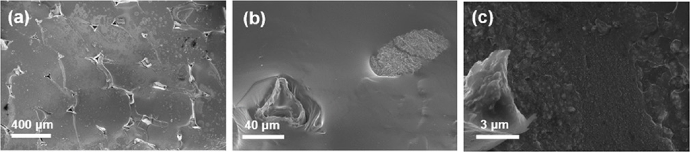 Figure 1 Morphology of the fractured composite surfaces: (a) Cu foam/epoxy; (b) Cu foam/MWCNT/epoxy; (c) Cu foam/MWCNT-MPTMSCu/epoxy. |
