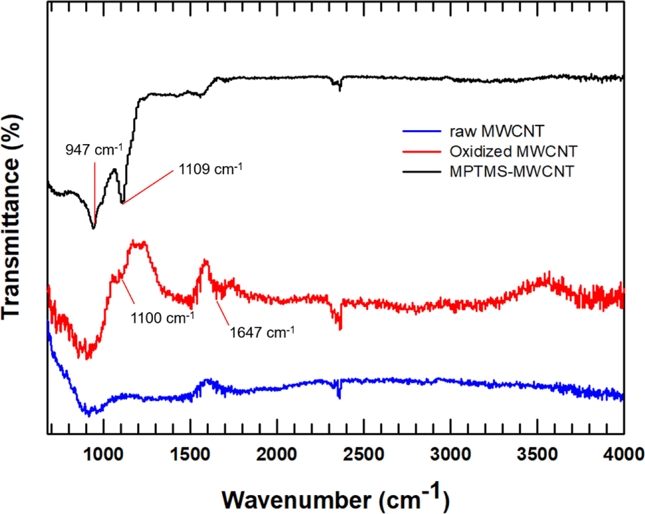 The functionalized MWCNTs were then analyzedby FTIR spectroscopy, as shown in Figure 2. Thus, the FTIR spectrum of the oxidized MWCNTs displays a broad absorption peak at 1100cm-1 and a weak absorption peak at 1647cm-1 corresponding to C=O of the carbonyl group, which is absent from the spectrum of the MWCNTs prior to oxidation.14 After the surface treatment of MWCNTs with MPTMS, an absorption peak at 947 cm-1 is observed, corresponding to Si-OH.14 Moreover, a peak at 1109 cm-1 is attributed to the Si-O-Si stretching vibration and indicates the presence of hydrolyzed MPTMS.15