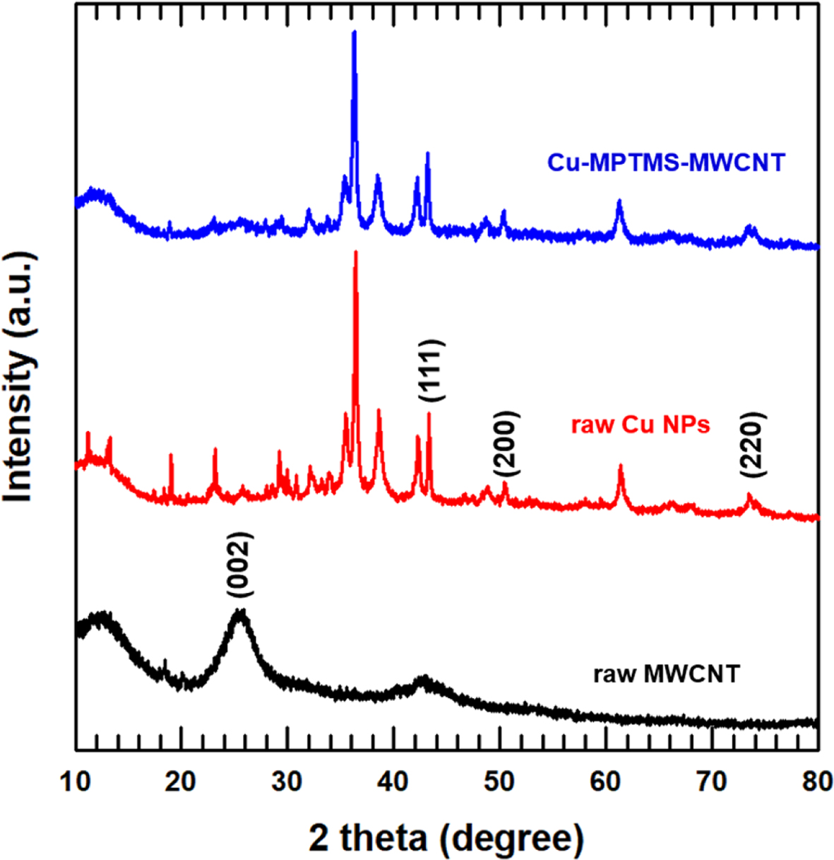 To further confirm the surface functionalization and attachment of CuNPs, the XRD patterns of the untreated and treated MWCNTs are presented in Figure 3. Here, the MWCNT pattern displays a diffraction peak at 25.58°, which is attributed to layered structure,16 while the Cu-MPTMS-MWCNT pattern displays peaks at 2θ ≈ 43.31°, 50.48°, 73.49° corresponding to the (111), (200), and (220) planes of the CuNPs with a d-spacing of 0.21, 0.18, and 0.13nm, respectively,16,17 thus confirming good attachment of the CuNPs to the MWCNTs after the surface treatment with MPTMS.