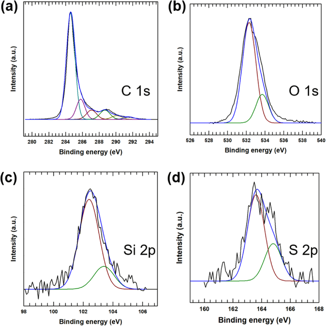 Figure 4 XPS analysis of MPTMS functionalized MWCNT: (a) C1s spectra; (b) O1s spectra; (c) Si2p spectra; (d) S2p spectra. |