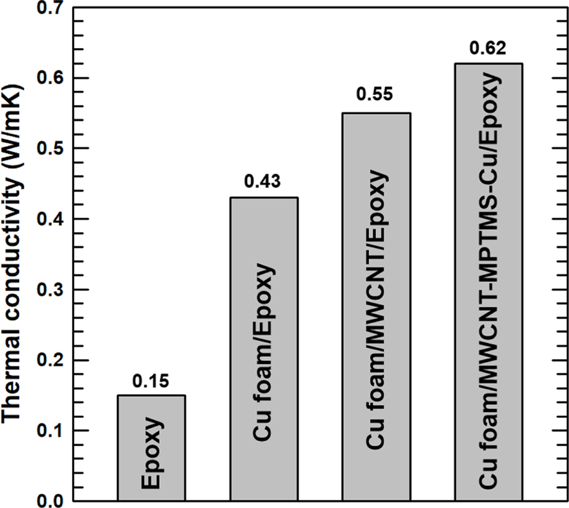 An epoxy composite with Cu foam functionalized with multiwall carbon nanotube was fabricated which exhibited enhanced thermal conductivity compared to untreated epoxy. Increased interfacial affinity between Cu foam and MWCNT was achieved due to 3-mercaptopropyl trimethoxysilane used as a coating agent.