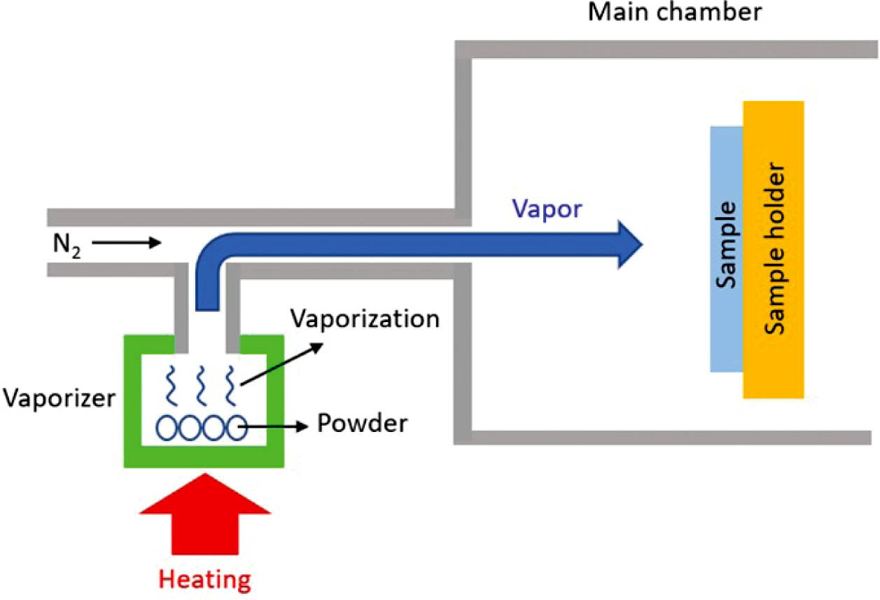 NLA 기술은 마스크나 열처리 등의 추가 없이 상부발광 올레드 위에 바로 나노렌즈를 형성하는 기술로서, 렌즈 제작공정 적용으로 인해 올레드가 손상되지 않을 뿐만 아니라 광추출 효율이 약 1.5배 향상되었다.5,6 더구나 진공증착 공정만을 이용하기 때문에, 제작공정이 매우 간단하고 올레드 산업현장에 바로 적용할 수 있는 기술이다. 나노렌즈를 형성하기 위해 유기 기상증착 공정(Figure 1)을 활용하는데, 기화기(vaporizer) 가열로 인해 생성된 증기는, 기화기 셔터를 열면 질소(N2) 가스의 도움으로 메인 체임버(main chamber)로 이동하며, 그 후 샘플에 도달하여 렌즈를 형성하게 된다. 이로부터 증기 생성량의 결정적인 실험변수들로는 기화기 가열온도와 가열 목표 온도에 도달한 후의 유지시간임을 알 수 있다. 본 논문에서는 핵심공정 변수들인 기화기 가열 온도와 유지시간에 따른 렌즈 형성 거동과 광학 전산모사 결과를 보고하고자 한다.