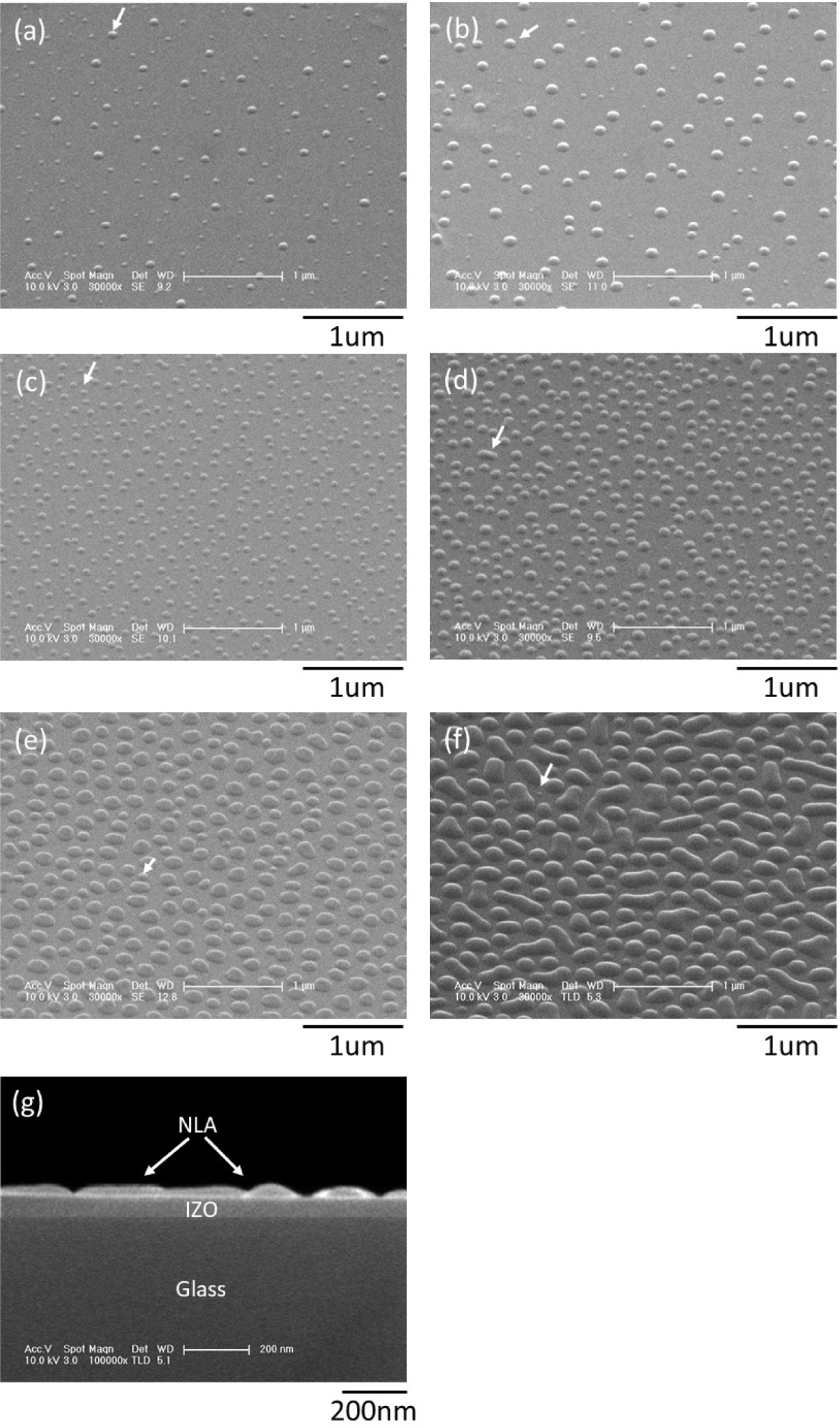 Figure 2(a)부터 2(f)까지는 기화기 가열조건에 따른 평면(planar) SEM 이미지이며 각 그림에 표기된 흰색 화살표는 유리/IZO 기판 위에 형성된 나노렌즈를 나타낸다. 300oC/5분 조건(Figure 2(a))에서는 구 형태이며 최소 50nm, 최대 100nm의 직경을 갖는 나노렌즈가 관찰된다. 10분으로 유지시간을 증가시키면 나노렌즈 갯수는 다소 줄어들지만 직경 값은 전반적으로 증가하며(Figure 2(b), 3(a)), 최대 직경 값은 약 150nm를 갖는다. 320oC/5분 조건(Figure 2(c))에서는 Figure 2(a) 대비 갯수가 크게 증가한다. 10분으로 유지시간을 증가시키면(Figure 2(d)), 300oC의 경우처럼 갯수는 다소 줄어들지만 렌즈 직경이 증가한다. 340oC/5분 조건(Figure 2(e))에서는 Figure 2(c) 대비 렌즈 갯수는 줄어들지만 렌즈 크기가 약 200nm로 증가하며 유지시간을 10분으로 증가시키면(Figure 2(f)), 200부터 600nm 범위의 직경을 갖는 나노렌즈가 관찰된다. Figure 2(g)는 Figure 2(f)에 대한 10만배 배율의 단면 SEM 이미지로서 유리/IZO 기판 위에 곡면 표면을 갖는 나노렌즈가 형성됨을 알 수 있다.