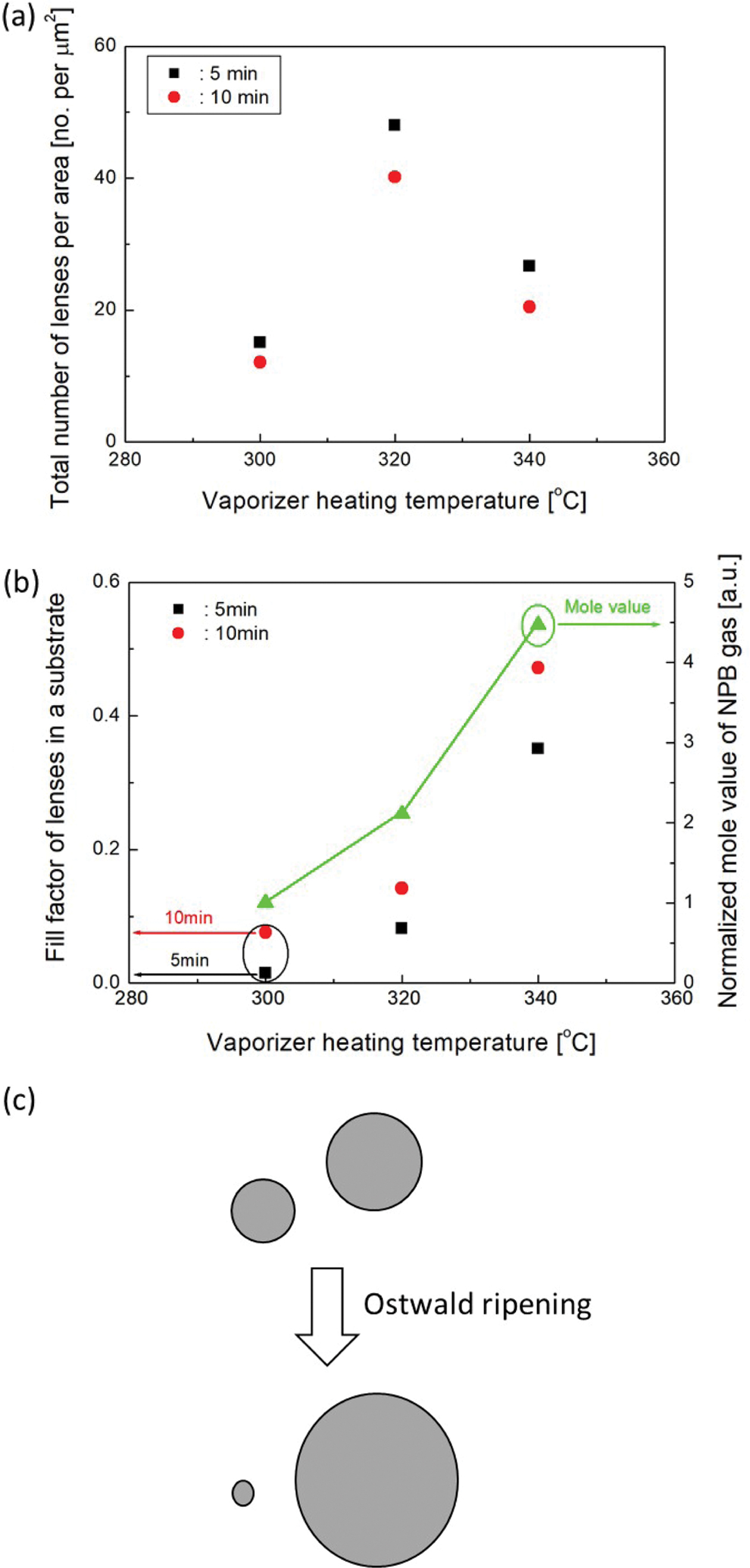 Figure 3 (a) Total number of lenses per area; (b) fill factor of lenses in a substrate and normalized mole value of NPB gas with vaporizer heating conditions; (c) nano-lens growth explained by Ostwald ripening mechanism. |