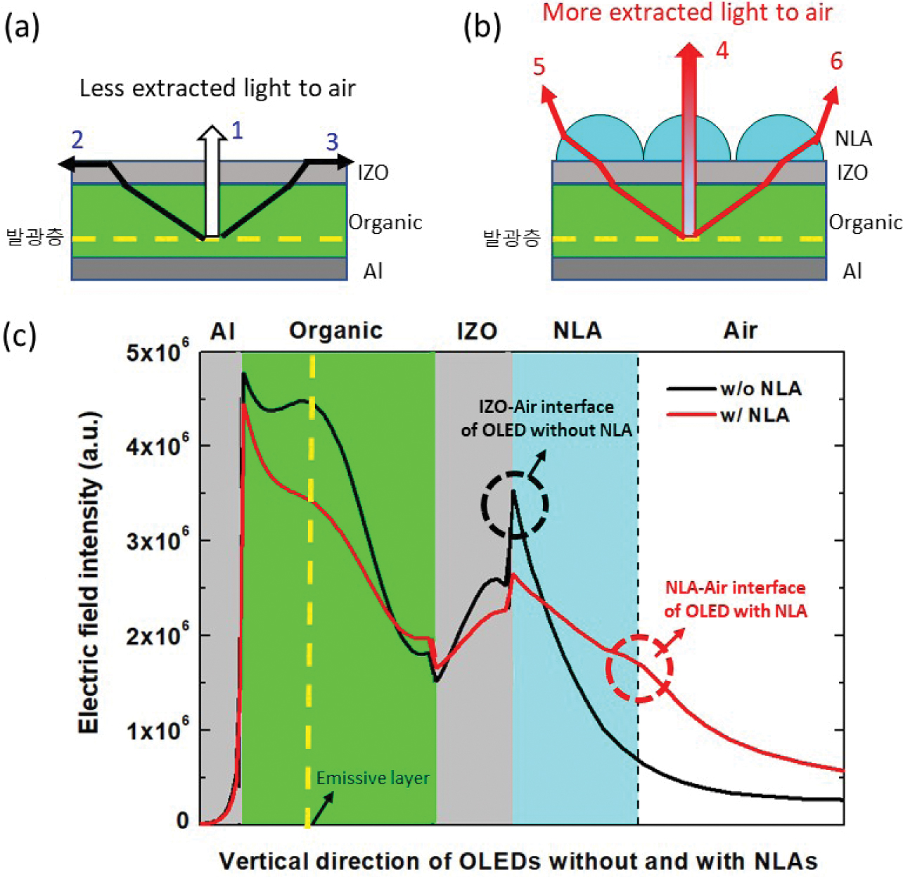 Figure 4 Top emission OLEDs (a) without; (b) with NLAs; (c) the variation of electric filed intensity in top emitting OLEDs without and with NLAs. |