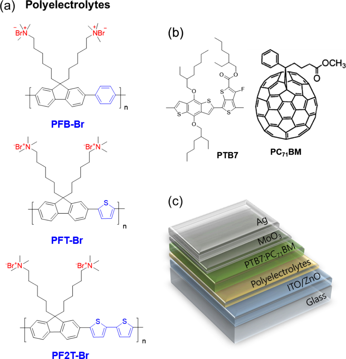 Figure 1 Chemical structure of (a) conjugated polyelectrolytes; (b) PTB7 and PC71BM; (c) device architecture of iPSC in this research. |