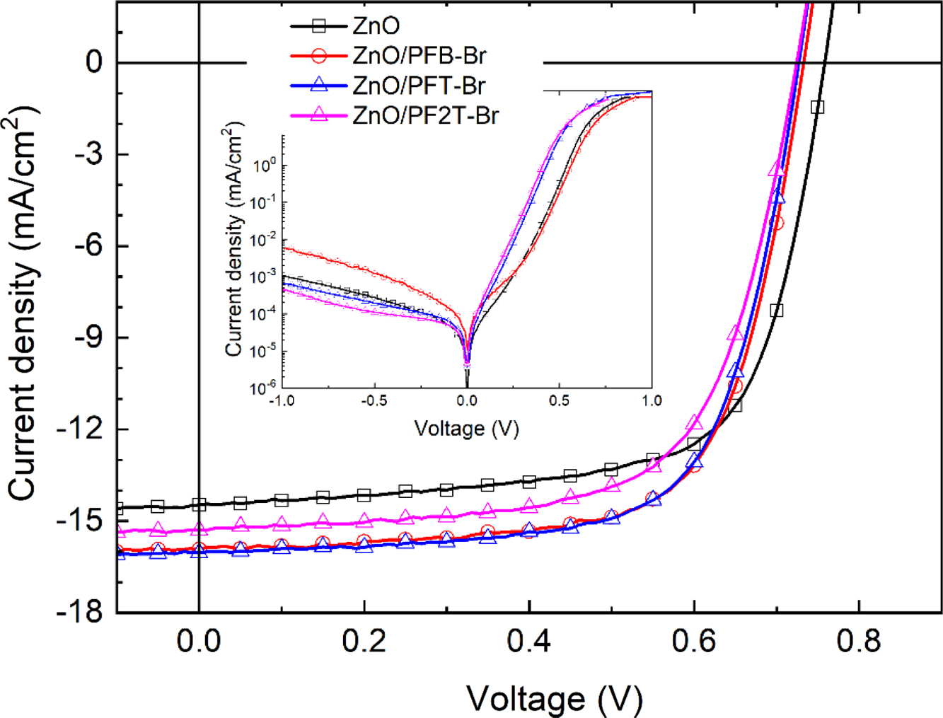 In this work, we fabricated iPSCs by using ZnO film with CPEs as an interlayer. Interestingly, CPEs on the ZnO surface re-modulate the interfacial interaction, reducing the energy offset and increasing the charge collection capability.37,40-42 The CPEs in this work are composed of the various backbone structure by inserting different moieties, including polyfluorene with phenyl (PFB), polyfluorene with thiophene (PFT), and polyfluorene with bithiophene (PF2T). The CPEs were designed and synthesized to study the effect of the backbone structure that could influence the performance of the device. To avoiding intermixing (orthogonal-solubility) with the active layer, the polymers have been quaternarized with trimethylamine. Thus, the CPEs can be processed from the alcoholic solvent. The structure of CPEs have the hydrophobic characteristics in the main chains, and the side chain has hydrophilic characteristics due to the ionic part at the end of the alkyl chain. Thus, quaternarized polyfluorene with trimethylamine, which alters solubility, can be an alternative for increasing device performance.43 Ionic functionalities in the CPEs are accrued on the ZnO surface owing to attractive interaction between the ionic salts and the hydrophilic ZnO. This indicates that the re-organization of CPEs occurs during the formation of CPE film.44 Also, the CPE backbone is directed away from the ZnO surface. Consequently, there are formation of interface dipole due to a redistribution of the internal electric field.45,46 As mentioned above, PFB-Br, PFT-Br, and PF2T-Br have different electronic properties of backbone, PFT-Br, and PF2T-Br have more electron-rich backbone than PFB-Br. Detailed investigations are performed to reveal the effect of various CPE backbone in iPSCs. As a result, the devices based on ZnO/CPE improve the power conversion efficiency compared to the device based on ZnO only. The PCE of the devices with CPE PFB-Br, PFT-Br, and PF2T-Br was 7.98% (Jsc=14.6mA/cm2, Voc=0.76V, FF=67.0%), 7.95% (Jsc= 15.9mA/cm2, Voc = 0.73 V, FF = 67.9%), and 7.95% (Jsc=15.3 mA/cm2, Voc=0.72V, FF=66.1%). The device based on ZnO has a typical open-circuit voltage (Voc) of 0.76V, a short-circuit current density (Jsc) of 14.6mA/cm2, and fill factor (FF) of 67.0% and PCE 7.41%. The main contribution for enhancing the PCE was the improvement of Jsc.
