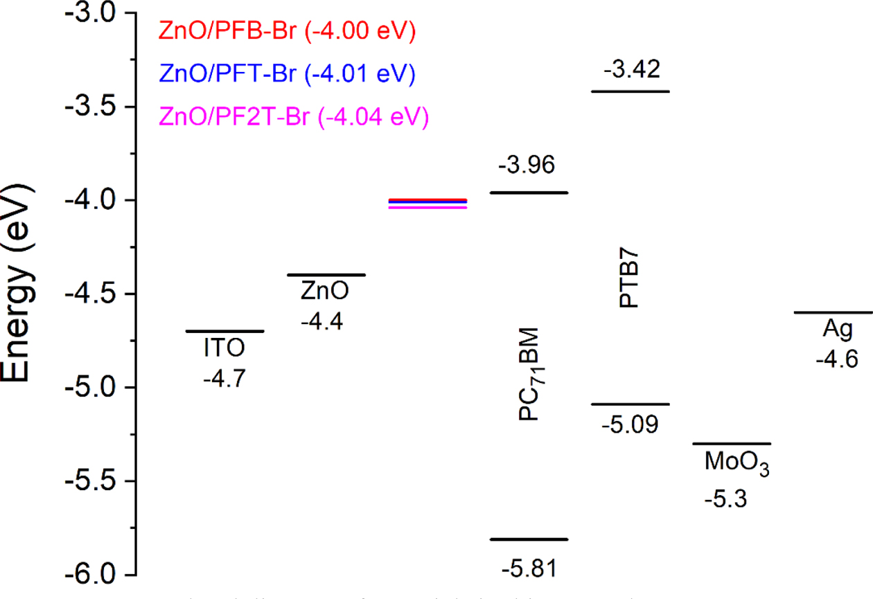 We performed Kelvin probe microscopy (KPM) measurements to investigate the effect of interlayer on the work function of ZnO.21,52-57 The charge collection interrupt in the devices due to a larger Schottky barrier. Therefore, the formation of Ohmic contact is one of the critical factors in achieving a high Jsc. As shown in Figure 3, the work function of ZnO with PFB-Br, PFT-Br, and PF2T-Br were -4.00, -4.01, and -4.04 eV, respectively, while the work function of ZnO was -4.4 eV. The change of the ZnO work function after introducing CPE indicates the reduction of Schottky barrier height and improvement in Jsc. Herein, it was founded that the Jsc improvement indicates the formation of favorable interface dipole. The work function of CPE was slightly different from PFB-Br, PFT-Br, and PF2T-Br. However, the change in the work function of ZnO not dependent upon changing the backbone structure of CPE. Calculated Jsc data from the IPCE curves (Figure S3) were coherent with the change Jsc data obtained from the devices under 1.0 sun condition.