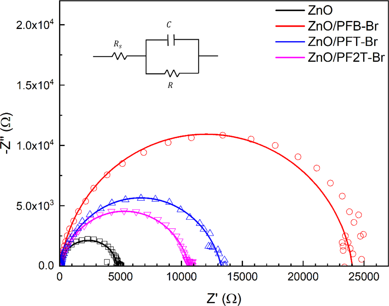 The electrical impedance spectroscopy (EIS) under the dark condition of the devices was performed to investigate the carrier transport and recombination. The EIS measurement showed the Nyquist plots of the PSCs at the Voc condition. The EIS spectra were linearly fitted to calculate the recombination resistance (Rrec). The EIS spectra are composed of two depressed semi-circles. In the plot (Figure 4), a high-frequency region corresponds to the response of the photoactive layer, while the lower frequency region corresponds to the response interlayer electrode.62,63 The semi-circle size of EIS relates to the magnitude of Rrec and the amount of the charge recombination in PSCs.63-65 The Rrec of PFB-Br, PFT-Br, and PF2T-Br based devices were 23.87, 12.47, and 10.65kW, respectively, and 4.75 kW for the device based on pristine ZnO. The device based on ZnO with PFB-Br showed the biggest Rrec, indicating the minimum recombination at the interface among the devices. The change of Rrec coherent with those of the FF of PSCs.