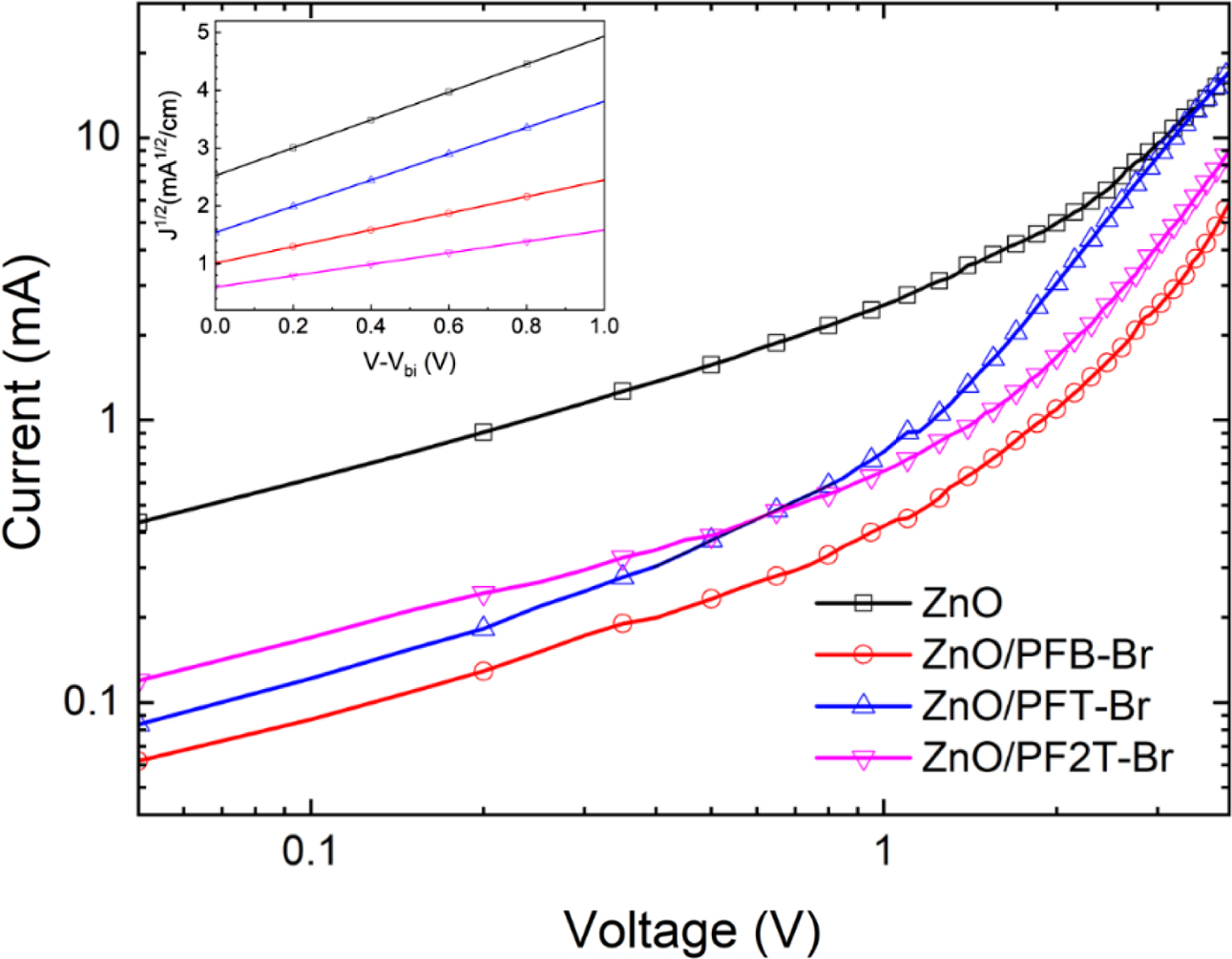 To further investigate the electron injection properties of the iPSCs with different CPEs, we fabricate a device based on electron-only with a structure of ITO/ZnO (25nm)/CPE/PC71BM/Al (100 nm). The electron mobility was estimated using the Mott–Gurney equation (Figure 5). The electron mobility of the electron-only devices with ZnO/PFB-Br, PFT-Br, PF2T-Br was 3.97×10-4, 3.27×10-4, 2.87×10-4cm2V-1s-1, respectively. CPEs shows higher electron mobility than the pristine ZnO (2.1×10-4 cm2V-1s-1). The Jsc data of the devices with CPEs were improved compared to pristine ZnO. Consequently, electron mobility through the changing of recombination resistance is derived from the CPE backbone orientation. During the spin-coating of CPEs, the ionic groups are moved toward the ZnO layer. In contrast, the hydrophobic part of the polyelectrolyte is shifted toward the surface of the active layer.