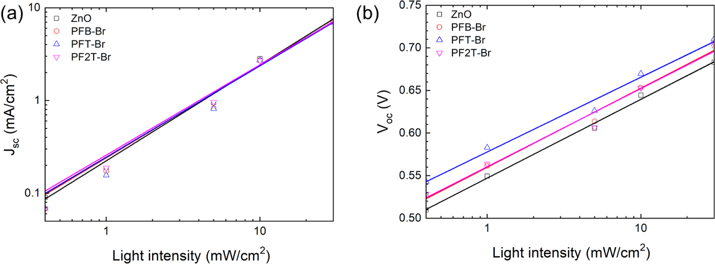 The Voc and Jsc of the devices vs. illumination intensity was plotted for investigating the charge recombination kinetics. The Voc vs. light intensity is briefly defined as Voc m skT/q ln(I). The Jsc vs. light intensity is defined as Jsc m Ia. Where I is the illumination intensity, k, T, and q are the Boltzmann constant, the temperature in Kelvin, and electron charge, respectively. When a values are nearest or equal to 1, the bimolecular recombination is dominated in the entire devices under short circuit conditions. In Figure 6, the value of α based on ZnO/PFB-Br, PFT-Br, PF2T-Br was 0.99, 0.98, and 0.97, respectively.