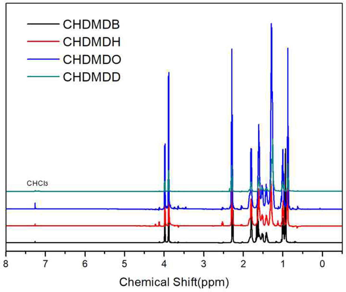Figure 2은 합성된 4종의 CHDM계 가소제에 대한 FTIR 스펙트럼이다. CHDM의 -OH 관능기는 스펙트럼에서 3500~ 3100 cm-1의 영역에서 관찰되나, 에스터화 반응 후의 생성물의 경우 이에 해당하는 피크는 관찰되지 않는 것을 확인하였다. 그리고 CHDM계 가소제 생성물 4종에서 ester 관능기에 해당하는 피크가 1750과 1300 cm-1에서 각각 관찰되었다.