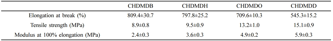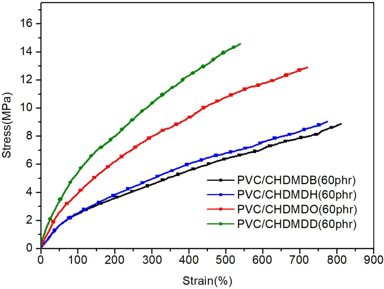PVC 배합 시편의 물리적 특성 평가. Figure 3과 Table 1은 합성된 4종의 가소제가 동일 함량(60 phr)으로 첨가된 PVC 배합 샘플의 strain-stress curve와 그 측정 결과이다. 연신율은 가소제의 지방산 단위구조의 길이가 길어질수록, 즉 CHDMDB, CHDMDH, CHDMDO, 그리고 CHDMDD 순으로 감소하였고, 인장강도 및 탄성률의 경우에는 반대로 지방산의 단위구조의 길이가 길어질수록 증가하는 경향을 보여주었다. 비교적 카본 수가 적은 butyrate(C4) 및 hexanoate(C6) 구조 함유 CHDM계 가소제가 PVC에 대해서 가소화 효율이 더욱 우수하며, 지방산 단위구조의 길이가 커질수록(즉, C8 및 C10 경우) 가소화 효율이 작아지는 것으로 관찰되었다.