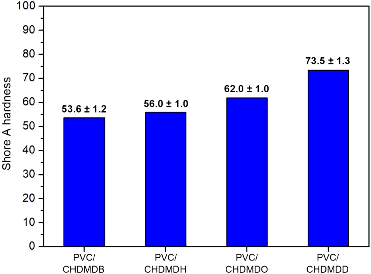 Shore A hardness of CHDM based plasticizer (60 phr) containing PVC samples.
