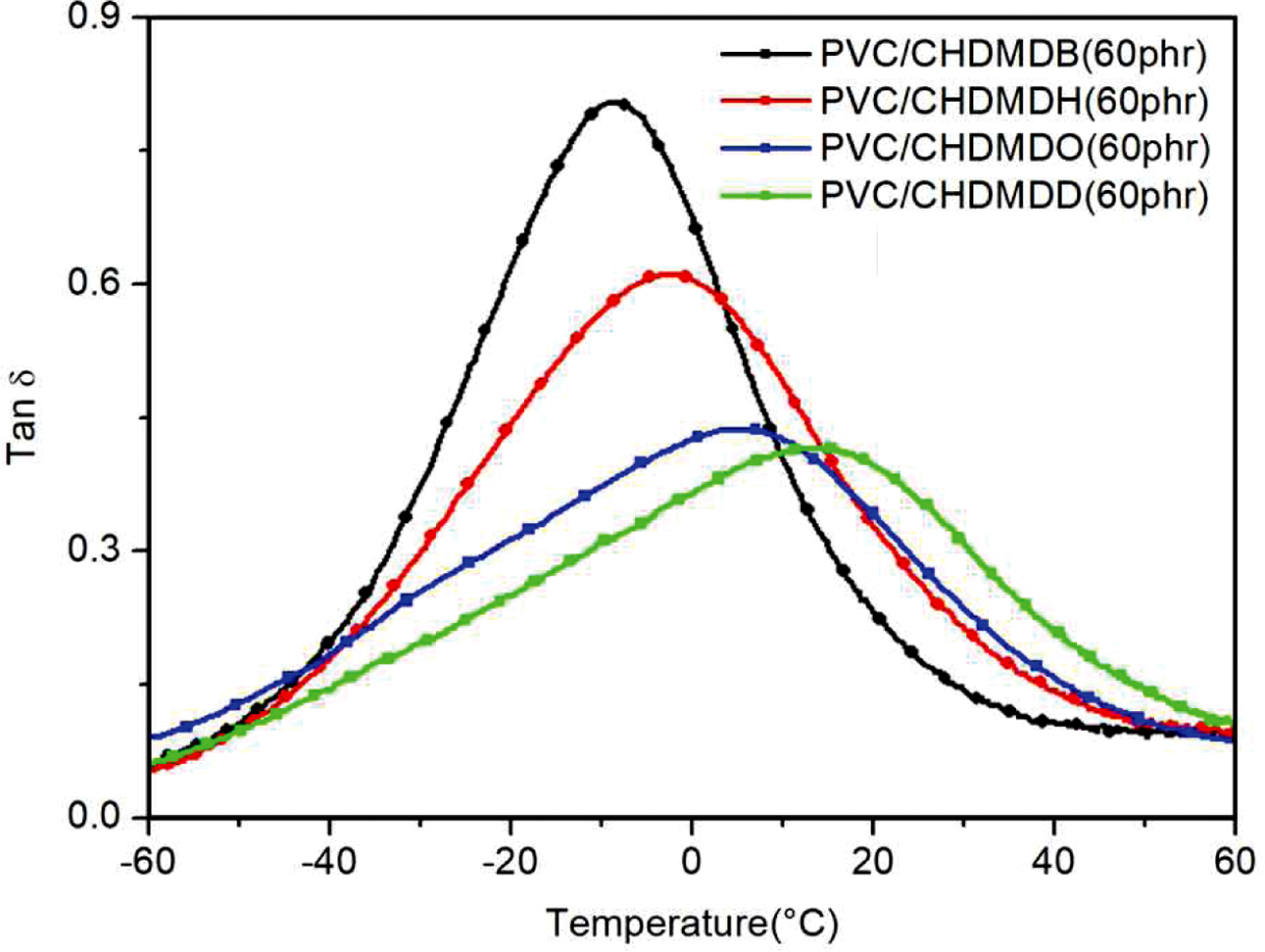 한편, 다양한 PVC 배합 시편의 유리 전이온도(Tg)를 측정하기 위해서 DMA 분석을 실시하였다. 유리 전이온도 분석은 합성된 CHDM계 가소제가 PVC 수지에 미치는 가소화 효율을 예측할 수 있는 효과적인 방법이다. Figure 6은 다양한 CHDM계 가소제(60 phr) 함유 PVC 배합 시편 4종의 온도에 따른 tan δ 값을 보여주고 있다. 각 피크의 최대값은 PVC 시편의 유리전이온도를 의미하며 CHDMDB의 경우 Tg -8.4 oC, CHDMDH Tg -2.7 oC, CHDMDO의 Tg 4.8 oC, 그리고 CHDMDD는 13.2 oC의 Tg 값을 갖는 것으로 관찰되었다. 이를 통해서 동일 함량 조건에서 합성된 CHDM계 가소제가 갖는 지방산 단위구조의 길이가 짧아질수록 PVC에 대한 가소화 효율은 증가하는 것을 확인하였다.