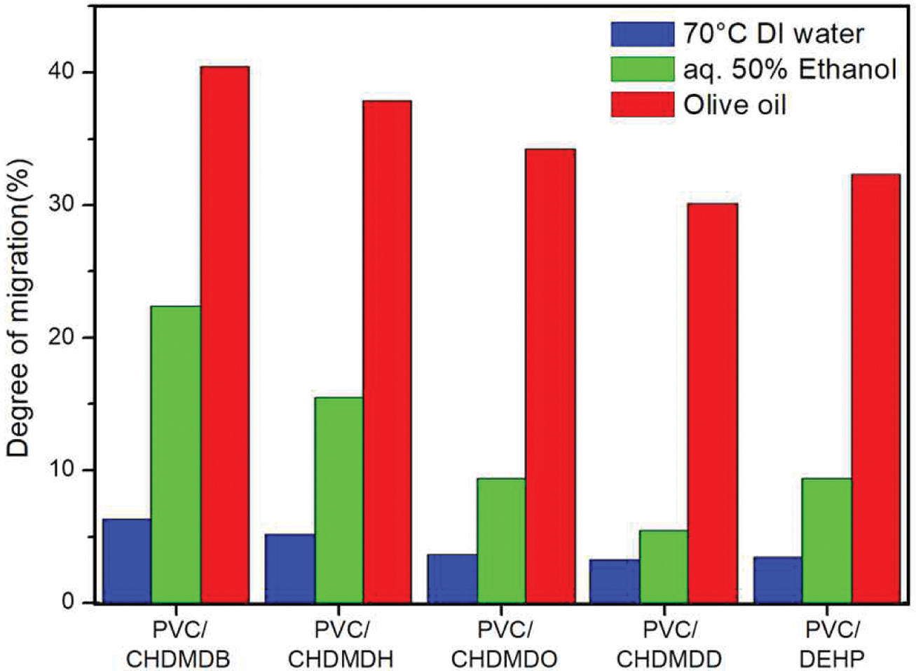 Degree of plasticizer migration for PVC samples containing various CHDM-based plasticizers (60 phr) for 24 h in 70 oC DI water, 50% ethanol and olive oil, respectively.