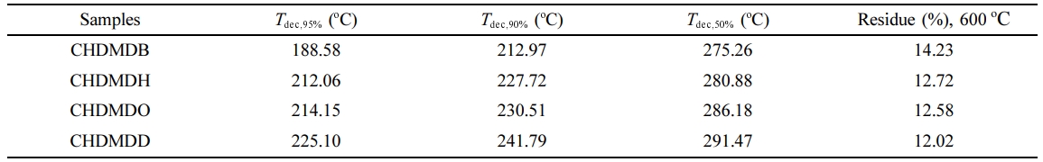 본 연구에서는 합성한 CHDM계 가소제가 PVC의 열 안정성에 미치는 영향을 알아보기 위해 TGA를 이용하여 열분석을 수행하였다. Table 2 및 Figure 5는 4종의 CHDM계 가소제가 동일 함량(60 phr)으로 각각 첨가된 PVC 배합 시편의 TGA 결과를 보여주고 있다. 200 oC 전후의 1차적 무게 감소는 가소제의 표면이행 및 휘발로 기인하며 열분해의 경우, CHDMDB, CHDMDH, CHDMDO, 그리고 CHDMDD 순서로 무게 감소가 관찰되었으며, 지방산의 탄소 수가 가장 작은 그리고 분자량이 가장 작은 CHDMDB 가소제가 가장 빠르게 무게가 감소하였으며, 분자량이 가장 높은 CHDMDD가 가장 늦게 무게가 감소되는 것을 보여주었고, temporary char가 모든 가소제 함유 샘플에서 관찰되었으며, 600 oC 부근에서는 최종적인 탄화물이 12% 이상 수준에서 관찰되었다.