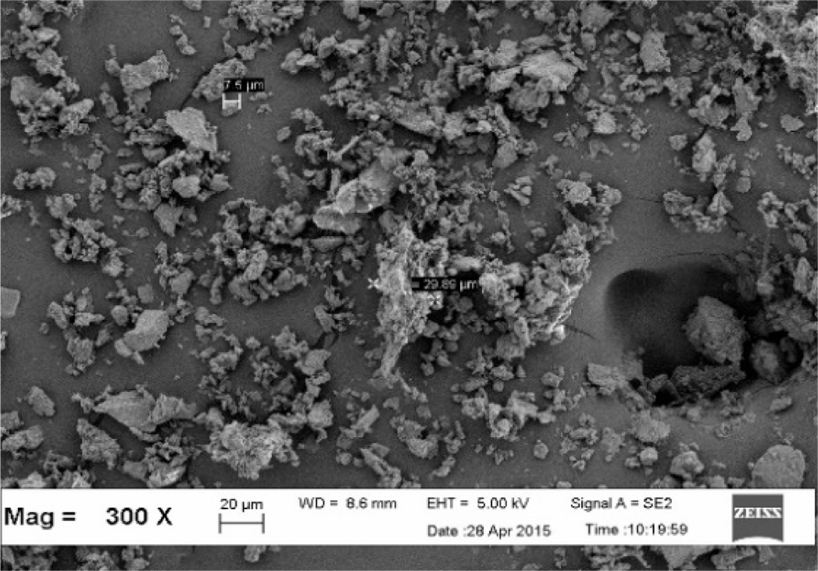 Characterization of Eggshell Powder. Figure 1 shows the SEM micrograph of eggshell powder (ESP) at a magnification of 300X. From the micrograph, the shape of ESP was seen to be irregular and the particle size varies from 7.5 to 29.8 µm. Apparently, the agglomeration of ESP was found.
