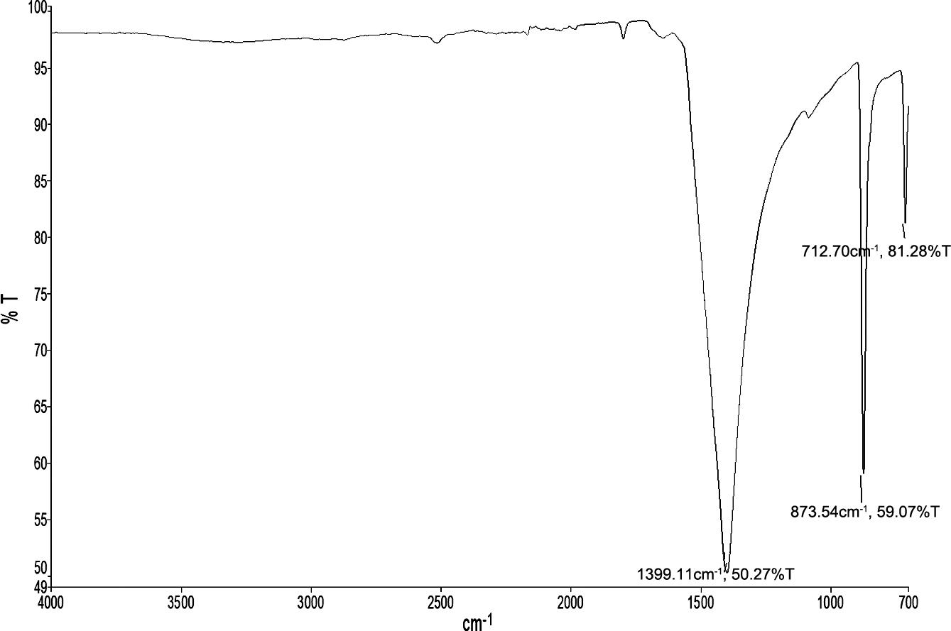 FTIR spectroscopy was used to seek evidence of the functional group presence in ESP. Figure 2 shows the spectrum of ESP. FTIR spectrum for ESP showed the three characteristic absorption bands in the fingerprint region. The strong broad absorption band at 1399.11 cm-1 is assigned to the OH bending vibrations, which is typically in the range from 1440-1395 cm-1. On the other hand, strong and sharp peaks at 873.54 and 712.70 cm-1 indicate the existence of C-O absorption band, which can be assigned to CO3 vibrations in ESP. The IR characteristics of CO3 observed is due to the occurrence of calcium carbonate composition. A similar observation was obtained from previous work by Intharapat and co-workers.22