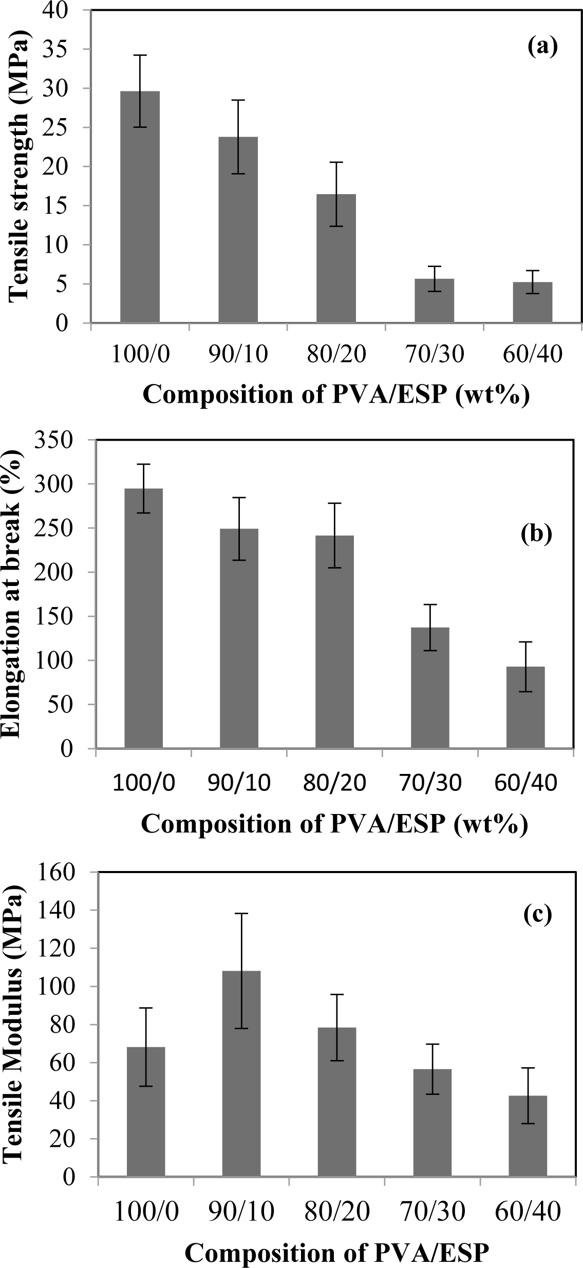 (a) Tensile strength of PVA/ESP biocomposites; (b) elongation at break of PVA/ESP biocomposite; (c) tensile modulus of PVA/ESP biocomposite at different compositions.