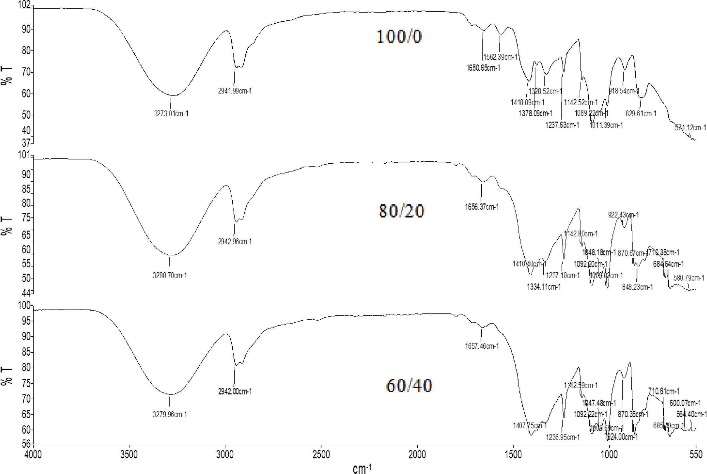 FTIR spectrum of PVA/ ESP blend for 100/0 wt%, 80/20 wt %, and 60/40 wt% composition