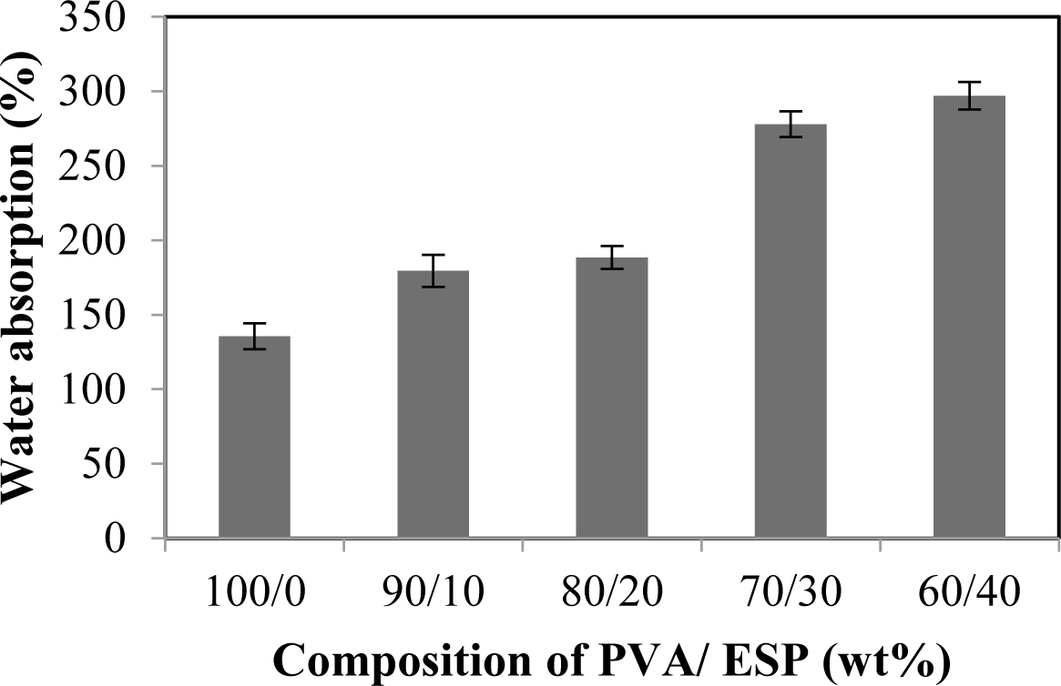Water absorption percentage of PVA/ESP biocomposite at different compositions.