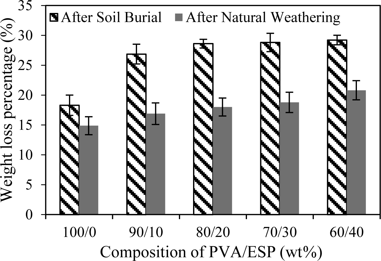 Weight loss of PVA/ESP biocomposite at different composition after soil burial and natural weathering test.