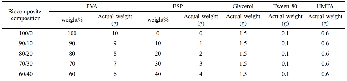 Biodegradability Test via Soil Burial and Natural Weathering: Biodegradability of PVA/ESP biocomposite was determined via weight loss percentage after 14 days of soil burial and weathering (ASTM D1425) respectively. The samples were cut into dumbell shape Type IV according to ASTM D882 and the initial weight was recorded. The tests were carried out at School of Material and Mineral Resources Engineering, Universiti Sains Malaysia, Nibong Tebal, Penang.
