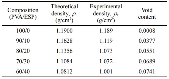 Density and Void Content Measurement. Density is one of the crucial properties for polymeric composite materials based on the properties-cost relation. Table 2 shows the theoretical density, experimental density, and the void content of biocomposite at different compositions. Three factors affecting the density of composite are the interfacial bonding, relative densities, and weight fraction of filler and matrix respectively. Theoretical density is solely based on the rule of mixture concept neglecting the flaws within composite. Theoretical density of PVA/ESP biocomposite decreased as the filler loading increased because density of ESP is lower than PVA. Decrement in experimental density an observed as the ESP loading increased. Thus, resulted to increment of void content. Generally, the void in the composite is due to poor interfacial adhesion between filler and matrix and also the agglomeration in the filler, resulted in a bigger gap between the agglomerates and matrix.