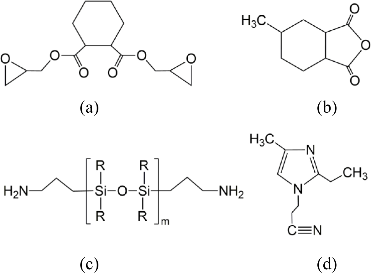 Figure 1 Chemical structures of epoxy resin, silicone rubber, hardener and accelerator used in this study: (a) Epoxy (ES602); (b) hardener (HJ5500); (c) silicone rubber (DC3055); (d) accelerator (2E4MZ-CN). |