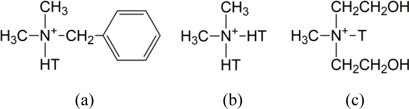 Figure 2 Chemical structures of nanoclay used in this study: (a) Cloisite 10A; (b) Cloisite 20A; (c) Cloisite 30B. |