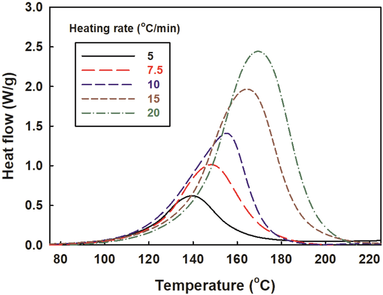 동적경화 반응.Figure 3은 나노클레이를 함유하지 않은 C0에 대해 승온속도를 달리하면서 측정한 전형적인 열경화성 수지의 DSC 결과이다. 온도가 증가함에 따라 약 80 oC부터 발열을 시작하여 피크를 보이고 180~220 oC까지 지속되었다. 승온속도가 증가함에 따라 피크가 더 높아지고 피크의 위치가 더 높은 온도에서 나타나는 것을 볼 수 있다.