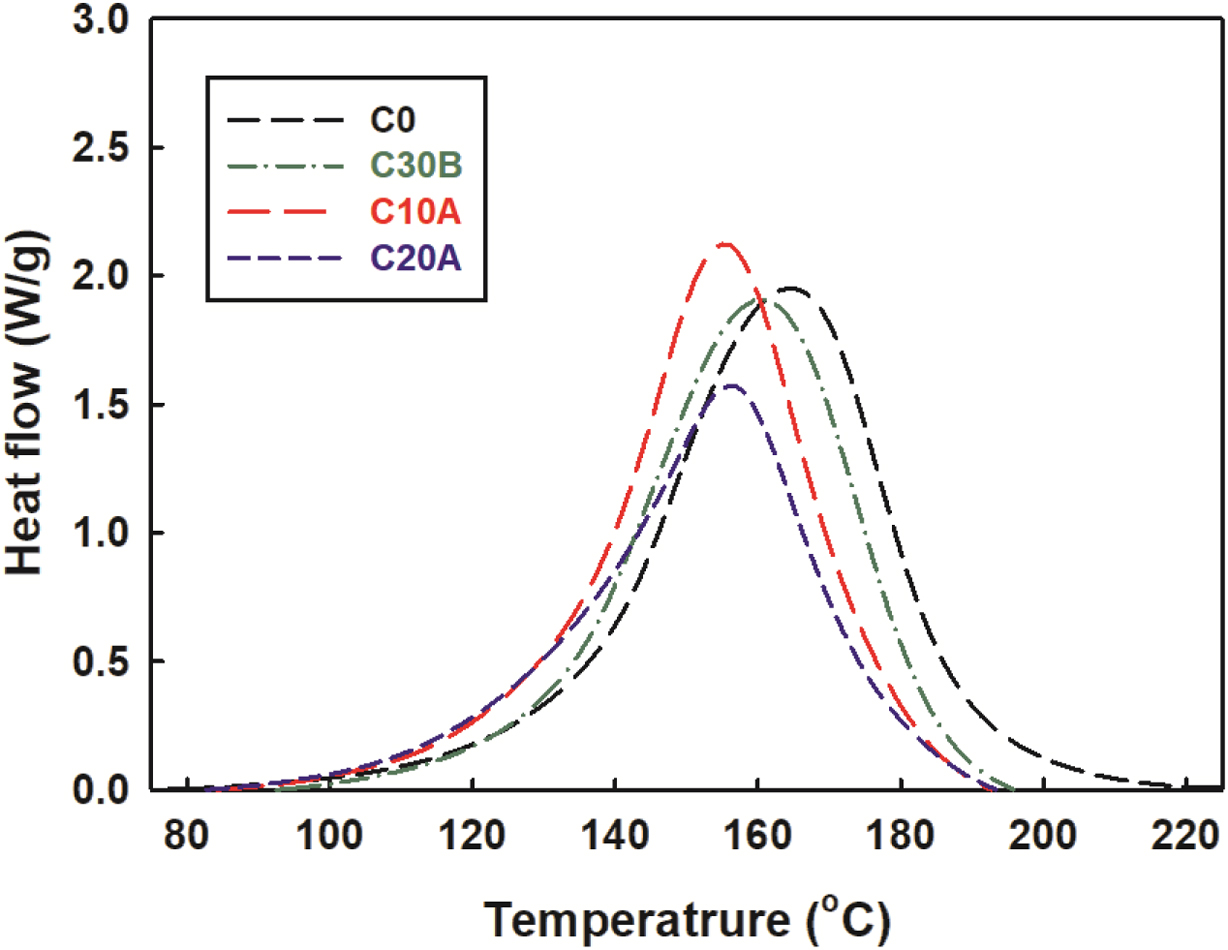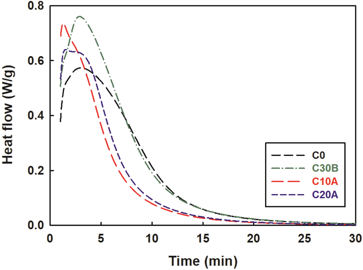 생겨서 빠르게 설정온도에 도달하였기 때문이라고 사료된다. 발열곡선의 아랫면을 시간에 대해 적분한 발열량을 정리하여 Table 2에 수록하였다. 단위 g 당 발열량은 C0 > C30B > C10A > C20A 순이었다. 나노복합체의 경우 첨가된 나노클레이의 종류에 따라 발열량의 차이가 발생하였는데 이는 첨가된 나노클레이의 구조에 기인하는 것으로 사료된다. 나노복합체의 표면에서 ammonium과 hydroxyl group의 반응촉진효과와 고온에서 나노복합체의 유기이온들이 homopolymerization을 촉진시켜 가교밀도를 낮추어 반응열을 감소시키는 효과와의 서로 경쟁적인 작용이 발생하는데 이러한 거동이 나노클레이의 종류에 따라 달라서 발열량의 차이가 발생한 것으로 판단된다.24-26