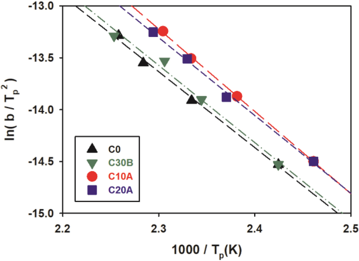 여기서, b는 승온속도(oC/min), Tp는 DSC 곡선 상에서의 피크온도(K) 그리고 R은 기체상수이다. 이 식은 피크온도에서의 경화도가 승온속도에 무관하게 일정하다는 가정 하에 유도된 것으로 여러 종류의 열경화성 수지에 적용된 바 있다.28,29 Figure 5는 식 (3)에서의 ln(b/Tp2)과 1000/Tp를 나노클레이에