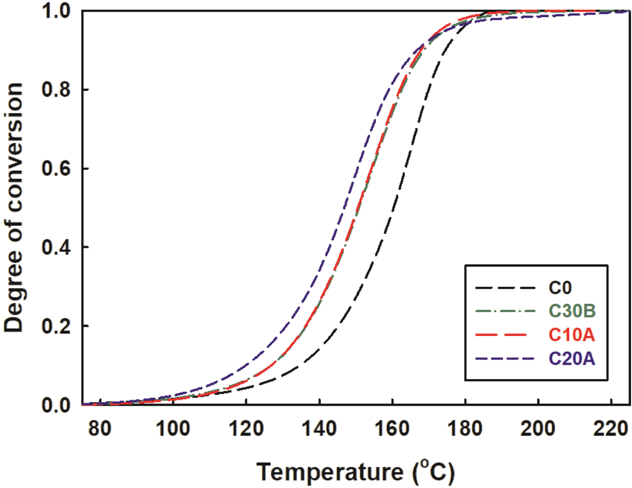 Figure 6에 승온속도 15 oC/min일 때 온도에 따른 각 나노복합체의 경화도 변화를 도시하였다. 나노복합체들의 경우가 C0에 비해 전반적으로 더 빠르게 경화가 진행되는 것을 볼 수 있는데 이는 Figure 4에서 설명한 열전달 효과에 기인한다고 사료된다.