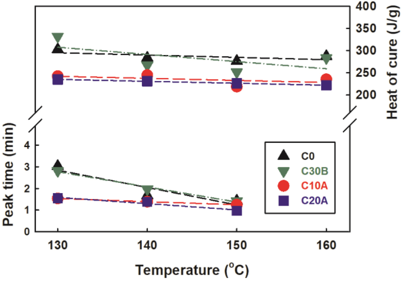 Figure 8에 경화온도 및 나노클레이 종류를 변화시켰을 때 나노복합체들의 발열피크 시간과 발열량을 도시하였는데 나노클레이 첨가여부와 첨가된 나노클레이의 구조의 영향을 받는 것을 알 수 있다. 동적경화의 경우와 비슷하게 온도가 증가함에 따라 전반적으로 피크시간이 짧아지며 발열이 더 빠르게 진행되었고 C0와 C30B보다 C10A와 C20B가 더 빠른 것을 볼 수 있었다. 발열량은 전체적으로 C30B를 제외하고는 온도에 따른 변화가 크지 않았는데 대체로 C0와 C30B가 C10A와 C20보다 큰 값을 보였다. 여기에서 160 oC에서의 피크시간을 도시하지 않았는데 이는 Figure 7에서 언급한 바와 같이 등온 온도가 올라감에 따라 초기에 피크가 발생하였고 160 oC의 경우에는 평형에 도달하는 과정에서 피크가 생겨서 그래프를 통해 피크시간을 얻을 수 없었기 때문이다. 그러나 적분값 등은 일부 오차를 감수하더라도 최대한 계산하여 그래프에 포함하였다.