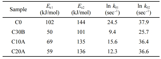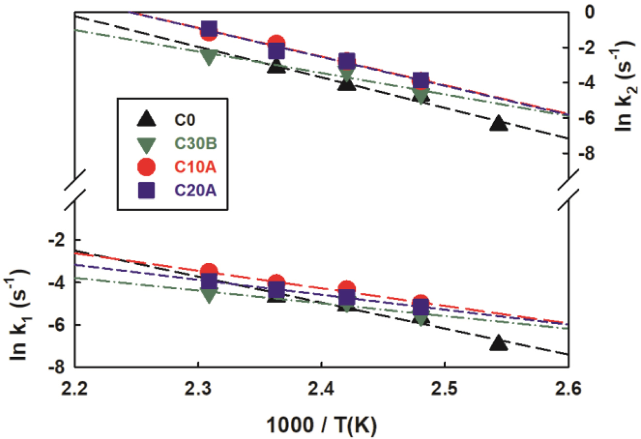 반응속도 상수 k1, k2에 대한 반응 활성화 에너지와 지수 앞자리인자(pre-exponential factor)를 구하기 위하여 반응속도 상수에 자연로그를 취하여 온도의 역수에 대해서 도시한 결과 Figure 9와 같이 대체로 직선 형태를 보였다. 직선의 기울기와 절편으로부터 각각 반응 활성화 에너지와 지수 앞자리인자를 구하여 Table 4에 정리하였다. 나노클레이가 첨가된 나노복합체의 경우 활성화 에너지와 지수 앞자리인자의 값이 떨어졌으며 특히 Ea1 및 ln k01 값들이 급격하게 감소하는 것을 볼 수 있었다.