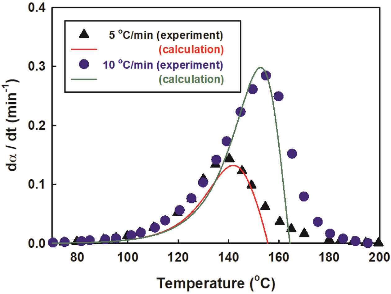 추가적으로 Figure 11에 등온 경화 데이터로부터 구한 개선된 Kamal 모델을 이용하여 동적 경화 데이터와 비교해 보았다. C0를 대상으로 승온속도가 5 oC/min, 10 oC/min일 때 온도에 따른 경화속도를 도시하였는데 Table 3의 m, n 값들이 온도에 따라 편차가 커서 피크 중심점에 가까운 온도에 해당하는 값을 사용하여 계산한 결과 비교적 잘 맞는 것을 볼 수 있었다. 그러나 피크를 지나 온도가 높아지는 영역에서는 계산 값이 실험 값보다 급격하게 떨어지는 것을 볼 수 있는데 이는 개선된 Kamal 식 하나만으로 동적 경화과정 전 영역에 대해 표현하는 것이 부족한 것을 의미한다. Macan 등은 이러한 문제를 해결하기 위해 낮은 온도 영역과 높은 온도 영역을 분리하여 Kamal 식을 도입하여 보완하고자 시도하였다.35 비록 개선된 Kamal 식이 등온경화 실험 결과를 잘 표현한다고 할지라도 데이터가 양호하게 측정되는 온도를 벗어나는 고온에서의 결과는 고온 실험의 한계로 인하여 적절하게 예측하기는 매우 어렵다. 따라서 향후에는 데이터 손실이 없는 동적경화실험을 이용한 모델의 개발 등 보완이 필요할 것으로 사료된다.