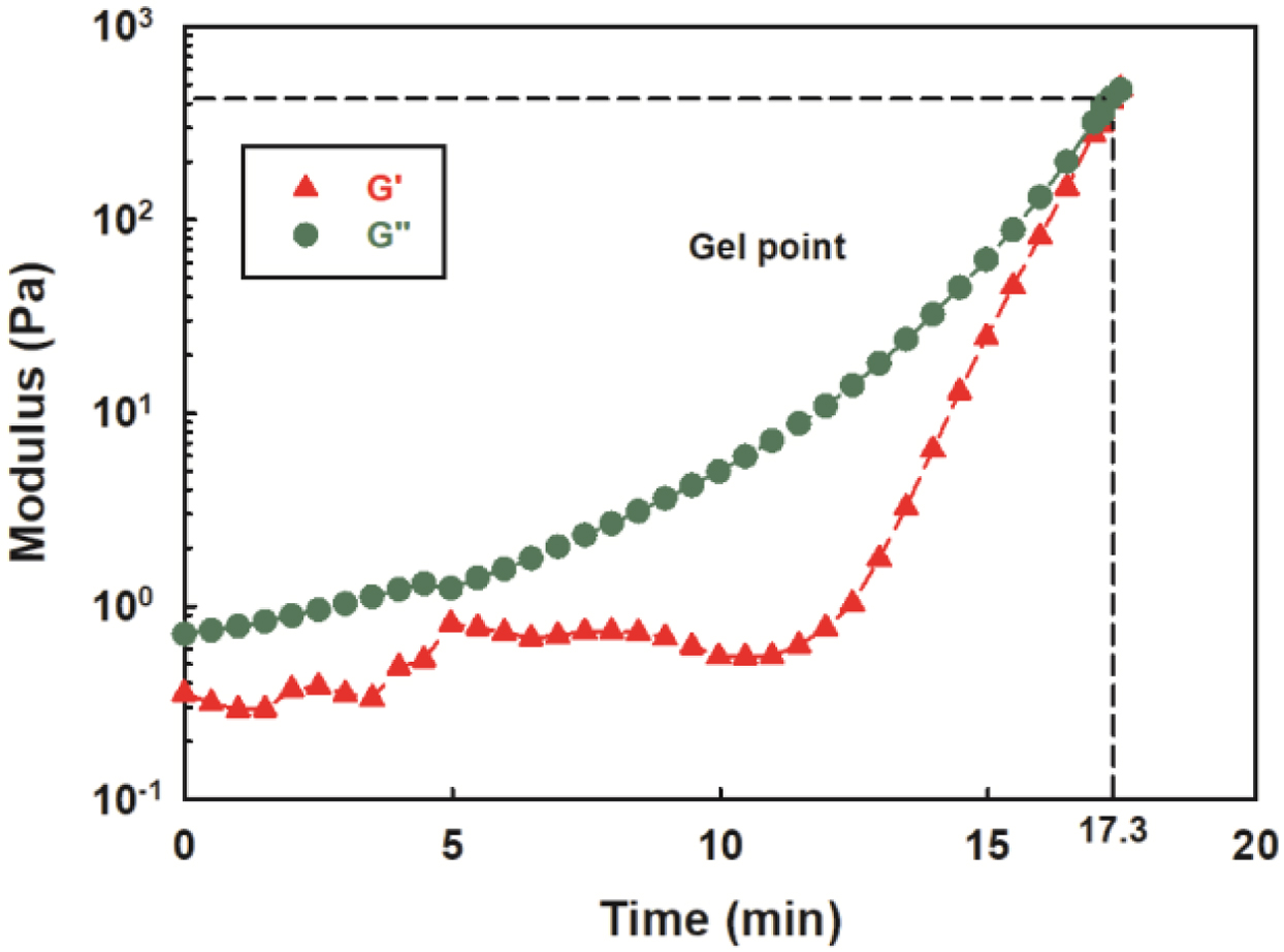 일반적으로 젤화시간은 시간에 따른 점도 변화의 변곡점이나 저장 모듈러스 G'와 손실 모듈러스 G''의 교차점, 즉 tand(=G''/G')=1에 도달하는 시간으로 정의하는데 이 시점에서 고분자 사슬이 충분히 서로 얽히어 점탄성의 유체가 점탄성의 고체로 전이되는 점을 의미한다.36 그림에서 G'와 G''가 같은 값을 보이는 젤화점을 점선으로 나타내었는데 이 때의 젤화시간은 약 17.3분 이었다.