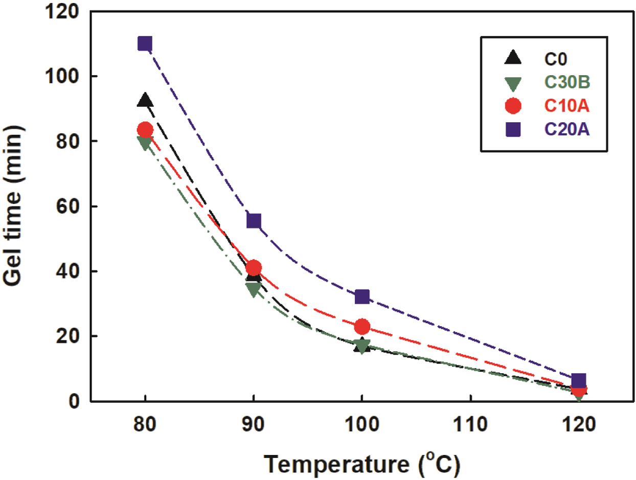 C0와 여러가지 나노복합체의 온도에 따른 젤화시간을 Figure 13에 도시하였다. 경화온도가 높을수록 젤화시간이 급격하게 감소하는데 이는 온도가 높으면 유동성이 증가하여 반응기 들이 서로 만날 확률이 높아지기 때문에 젤화시간이 감소하는 것으로 보인다. 젤화시간을 Table 5에 정리하여 수록하였다. 반면에, 같은 온도, 예를 들면 100 oC를 대상으로 샘플들의 젤화시간을 비교해 보면 C0 ≒ C30B < C10A < C20A으로 나노복합체의 경우 C0보다 젤화시간이 다소 증가하는 것을 볼 수 있다. 나노복합체의 경우 가리움 효과로 인해 반응기 들이 서로 만날 확률이 줄어들어 반응성이 감소하여 젤화시간이 증가하게 된 것으로 사료된다. 젤화시간과 온도와의 관계는 식 (6)과 같이 Arrhenius law 형태로 표시할 수 있다.