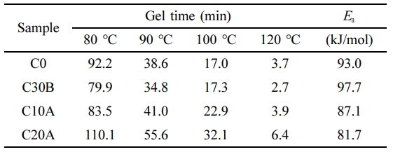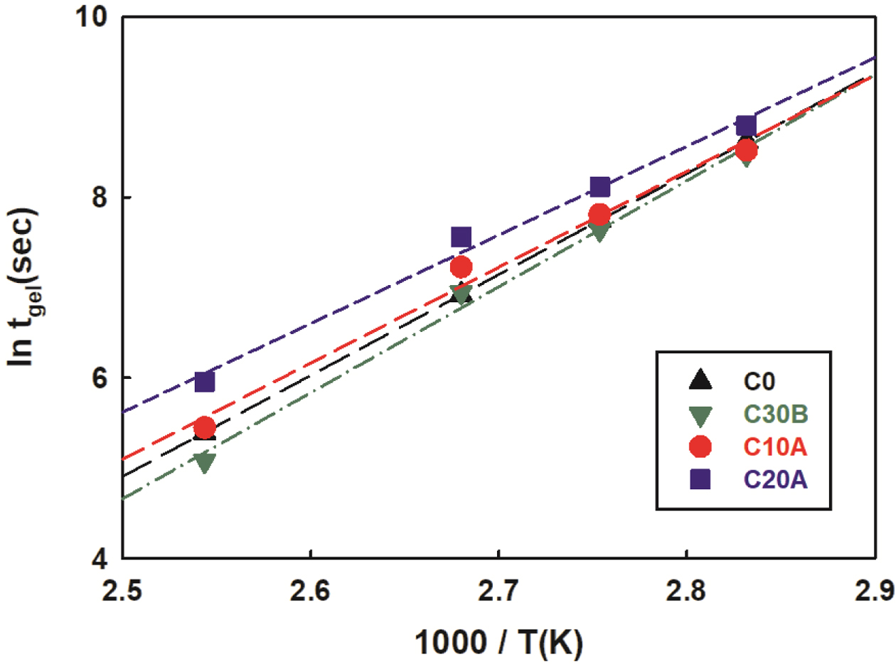 이 식을 이용하여 등온 조건에서 모듈러스 교차점을 기준으로 한 젤화시간을 온도의 온도의 역수에 대해 Figure 14에 도시하였고 기울기로부터 구한 Ea를 Table 5의 젤화시간에 추가하여 수록하였다. C30B를 제외하고는 C0에 비해 C10A와 C20A의 Ea가 감소한 것을 볼 수 있었다. 이러한 Ea의 경향은 앞의 동적경화 반응에서 Kissinger plot으로 얻은 값들의 경향과 다소 차이가 있는데 이는 열의 출입으로 얻은 Ea는 반응을 직접 표현하지만 점도 변화를 이용하여 구한 Ea는 반응뿐만 아니라 망상구조 등 점도에 영향을 미치는 요인들도 포함하는 바 이에 따른 차이라고 사료된다.