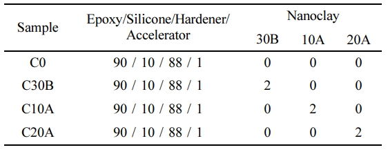 원료.본 연구에서 사용된 에폭시 수지는 지환형으로 에폭시 당량이 164~177 g/eq인 하진켐텍(한국)의 ES602를 정제하지 않고 그대로 사용하였으며, 액상 실리콘수지는 아민 당량이 250~270 g/eq인 Dow Corning(USA)의 DC3055를 사용하였다. 경화제로는 분자량이 168 g/mol인 하진켐텍의 HJ5500 (methyl hexahydrophtalic anhydride)를 사용하였고, 반응 촉진제는 시코쿠 카세이(일본)의 1-cyanoethyl-2-ethyl-4-methyl imidazole(2E4MZ-CN)을 사용하였다. 나노클레이는 세 종류로 Southern Clay사(미국)의 Cloisite 30B, 10A, 20A를 사용하였다. 본 연구에서 사용한 물질과 나노클레이의 구조식은 각각 Figure 1과 2와 같다.