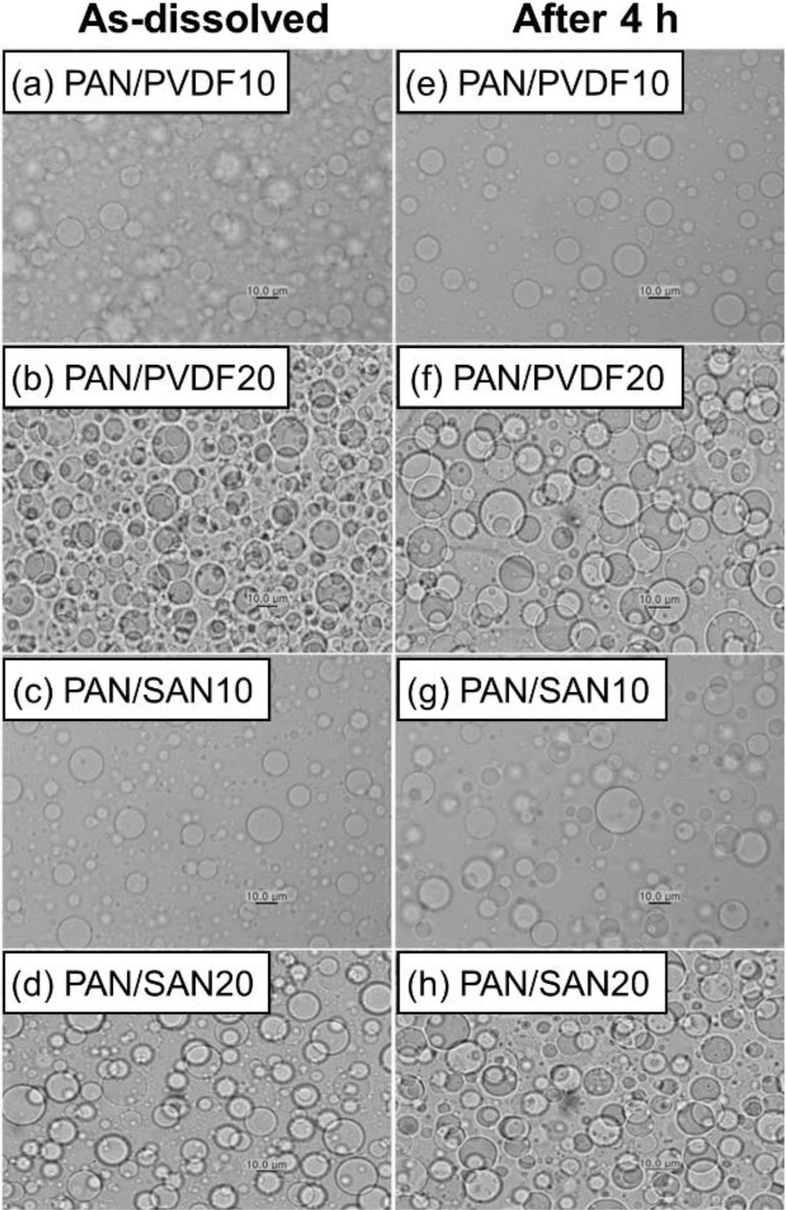 Figure 1 The optical microscopic images of as-dissolved (a) PAN/ PVDF10; (b) PAN/PVDF20; (c) PAN/SAN10; (d) PAN/SAN20 at the magnification of 50x. Images after 4 h are presented in (e~h). |