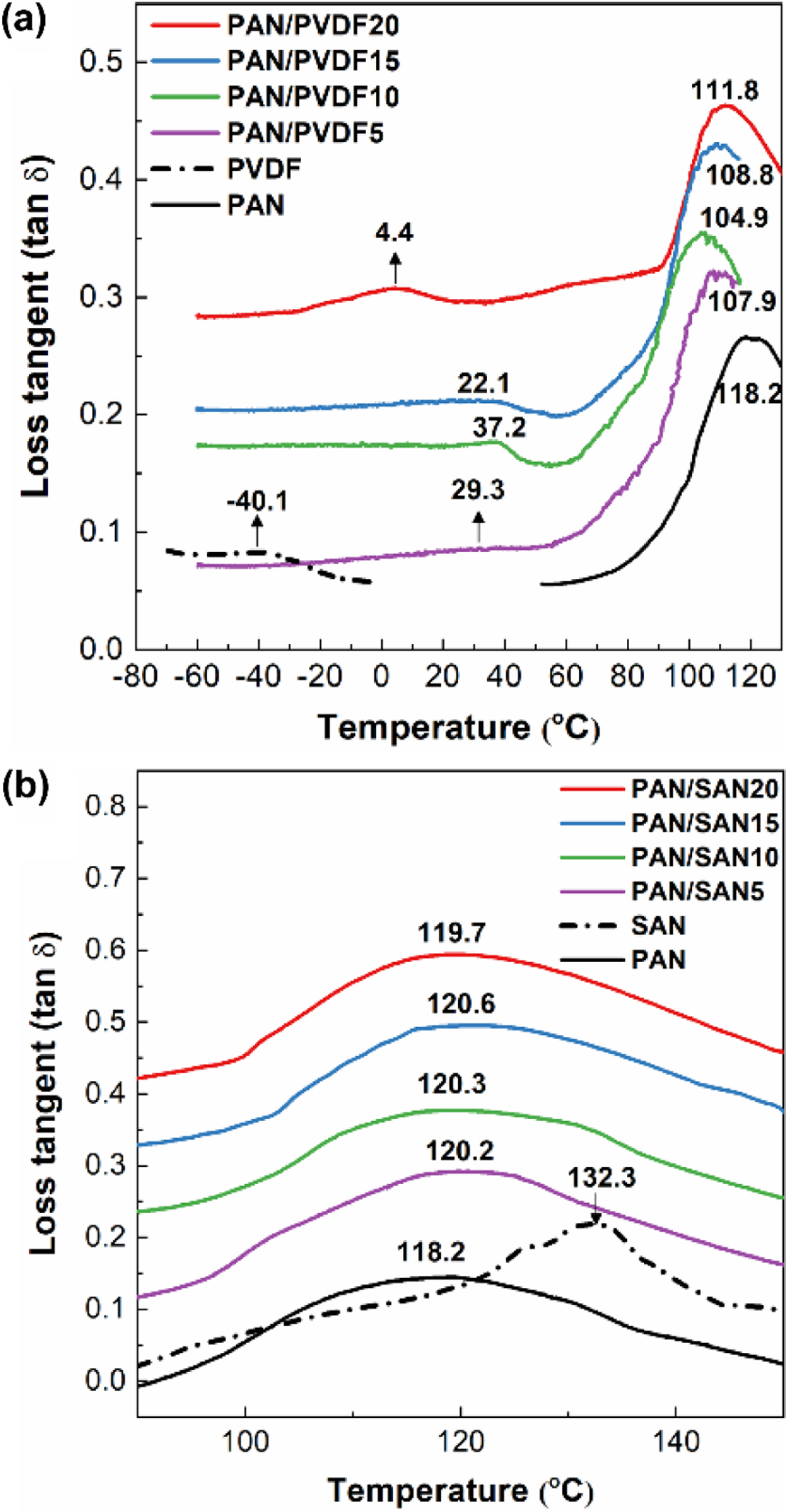 In PAN/PVDF blend systems (Figure 2(a)), the neat PAN and PVDF specimens give Tg at 118.2 and -40.1 °C, respectively, and their shifts to each other are obviously observed in the blend films. The peak shift is direct evidence of the interactive segmental motion of blended polymers. Particularly, PAN/PVDF10 film shows the strongest shift among the blend ratios; Tg of PAN at 104.9 °C (from 118.2 °C) and that of PVDF at 22.1 °C (from -40.1 °C).